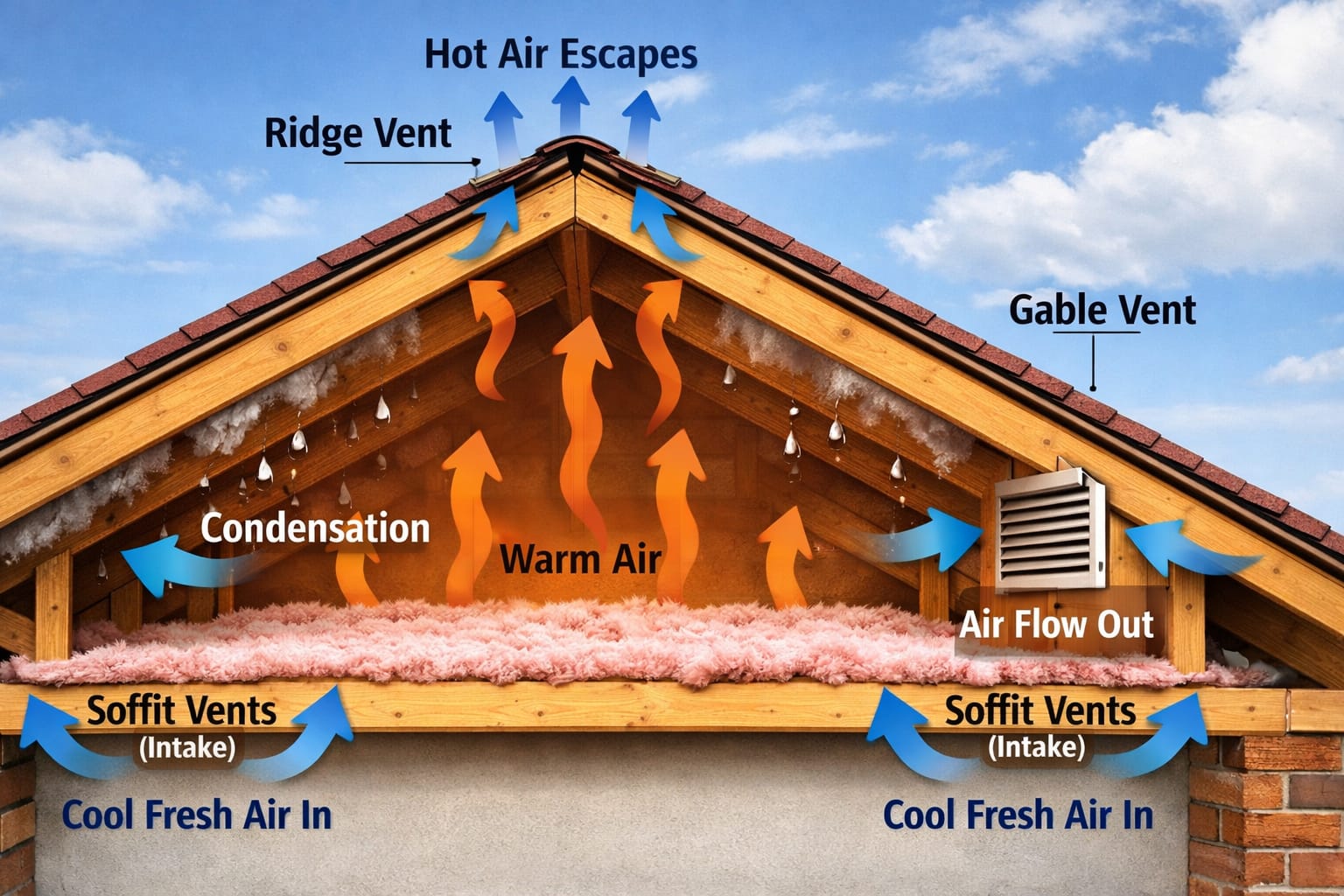 A properly ventilated roof operates on a simple principle: cool, fresh air enters through intake vents at the soffits (the underside of your roof’s overhang), travels across the underside of the roof deck, and exits through exhaust vents near the ridge. This continuous airflow does two critical jobs — it regulates temperature in summer and controls moisture in winter.